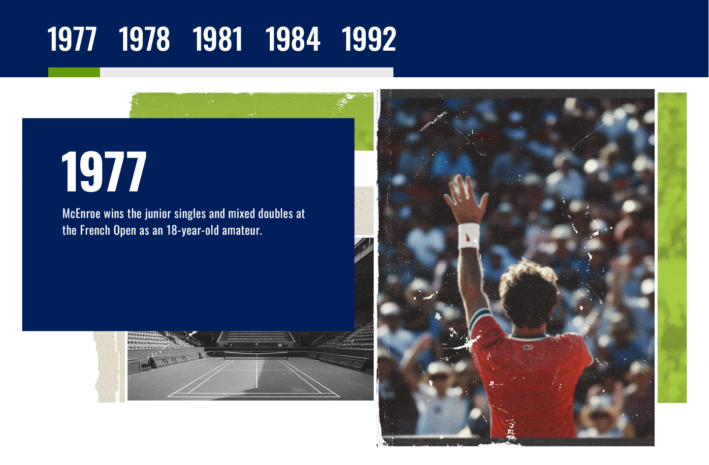 Bursting onto the scene in 1977 as an 18-year-old amateur, McEnroe won the junior singles and mixed doubles at the French Open. He then got as far as the semi-finals (from starting in the qualifiers) of Wimbledon, losing out to Jimmy Connors.