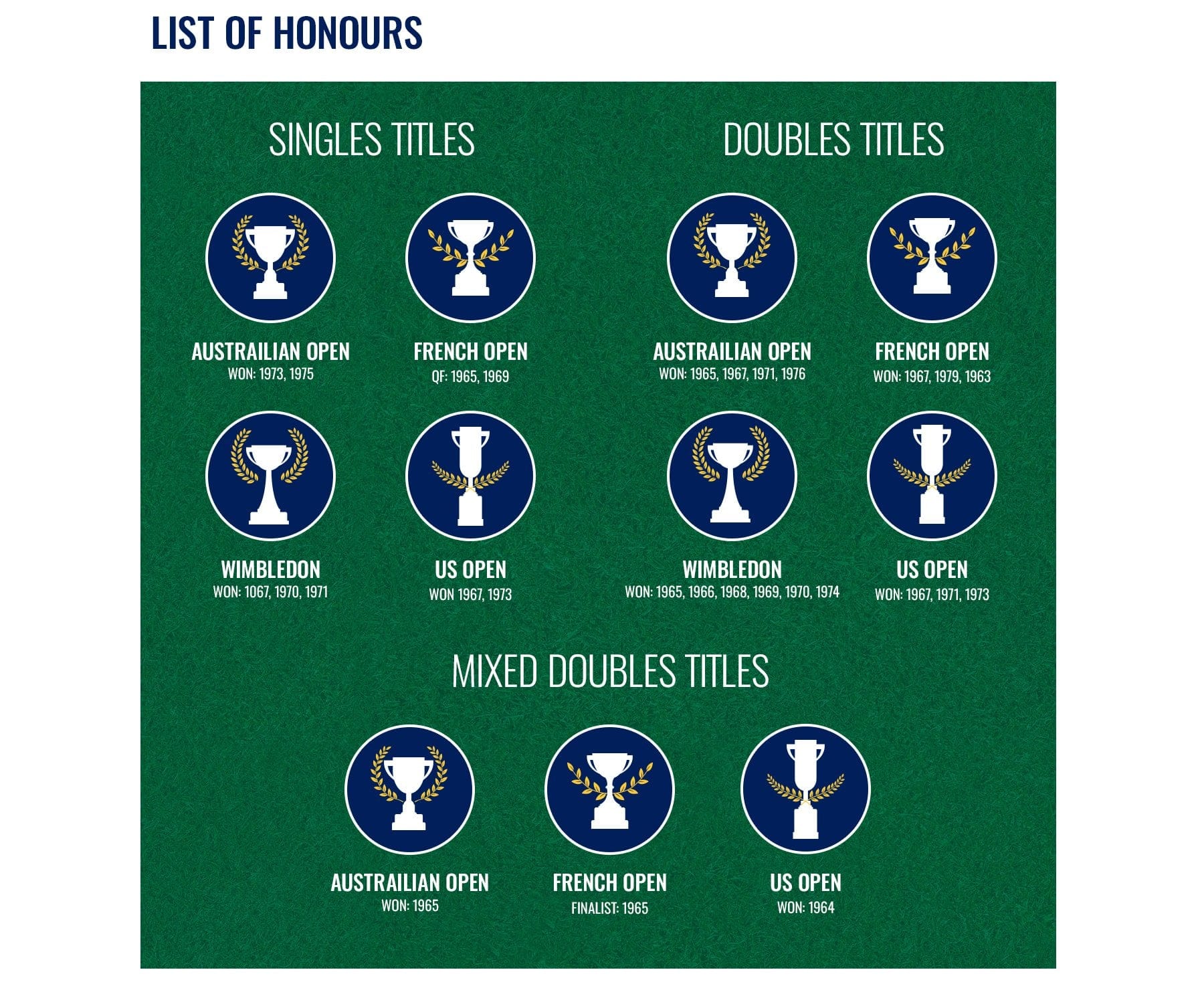 After securing his first Grand Slam victory at the Australian Championships in 1965, the pair went on to win the Wimbledon doubles title in the same year. Their sparkling partnership went on to win the Australian Doubles Championships three more times, Wimbledon four more times, the US Championships, the French Championships and the French Open.